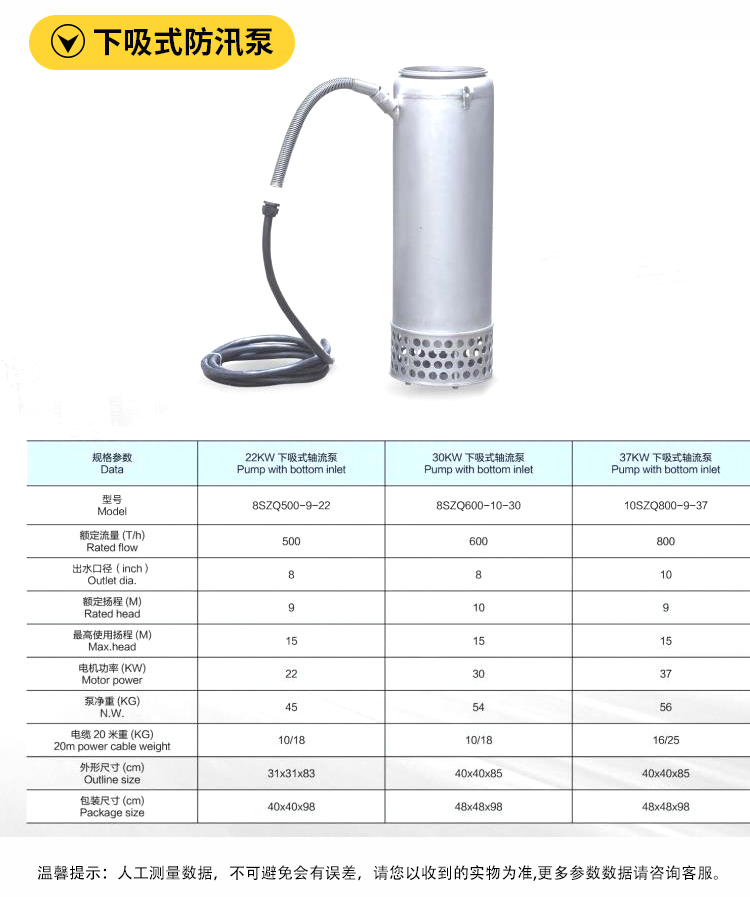 便攜式永磁防汛排澇潛水泵重量輕體積小、移動方便。流量大、適用場景廣泛、可根據(jù)用戶要求定做。采用不銹鋼